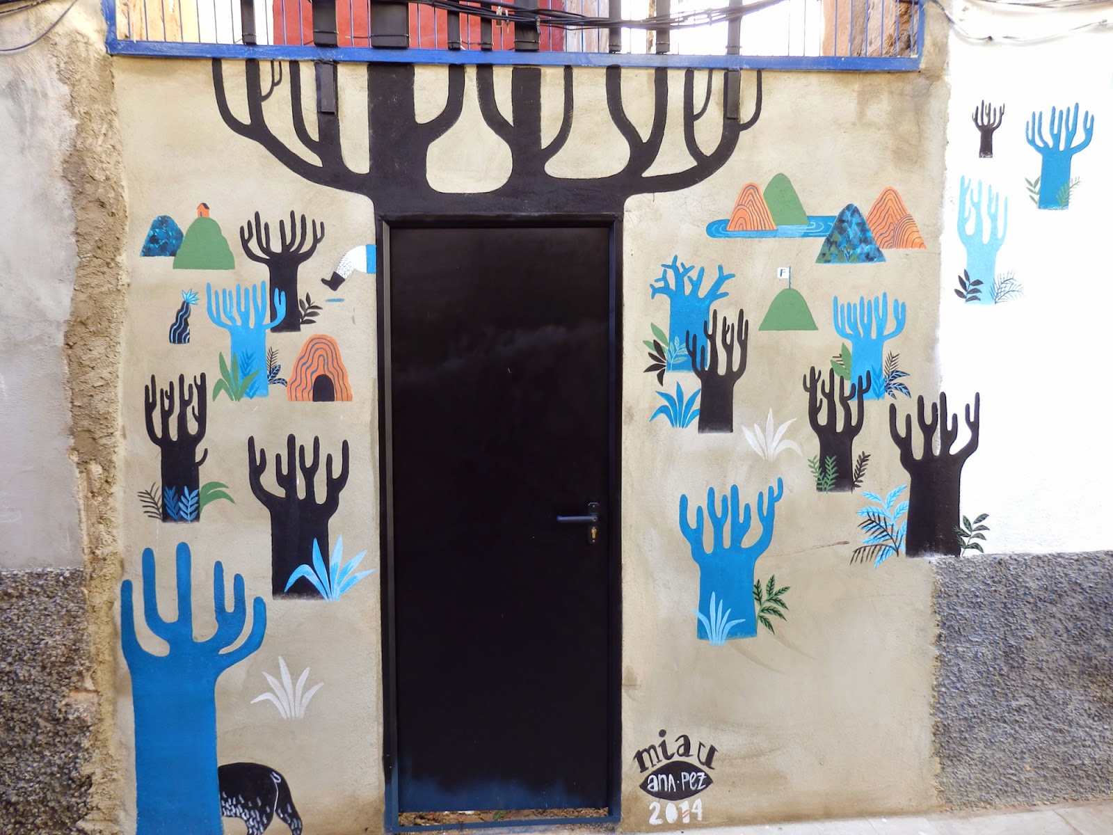 Para acabar, os dejo algunas fotos de mi intervención mural: Un pequeño bosque en una de las estrechas calles del centro del pueblo. Utilicé colores que se encontraban en esa misma calle, e integré una puerta para construir el árbol principal, cuyas ramas (con la ayuda de Julián Arranz, quien cortó, pintó y colocó las maderas) crecieron hasta salirse de la pared.