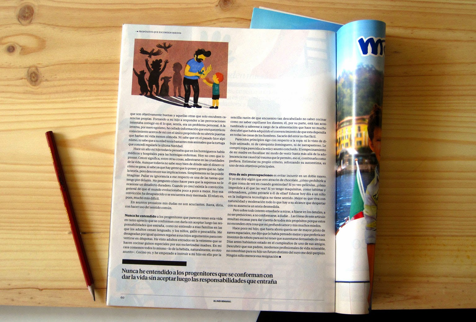 Colaboré en un especial de "Niños" con El País Semanal, el número del 22 de abril. El artículo que ilustré se llamaba "Propósitos que esconden miedos", de Marcos Giralt Torrente. Así quedó impreso: